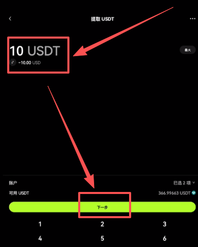 接下来输入我们要提币的数量,比如说我现在想提10个USDT,点击【下一步】。