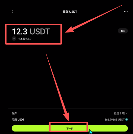 如果你还想让币安那边到手是10个U,我们这里的提取数量就不能写10了,你得加上它的网络手续费12.3,点击【下一步】。
