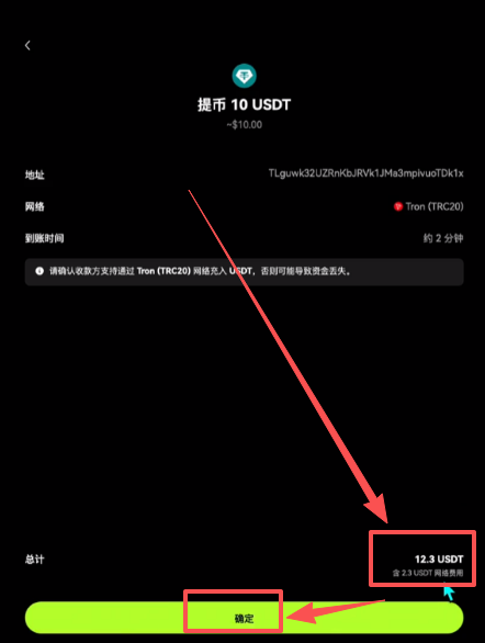 点击【确认】。一定要确认我们的地址以及转账网络是不是一一对应。