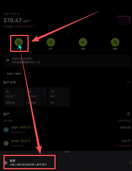 这个时候我们回到币安,来到资产,选择【充值】。