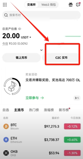 我们完成身份认证之后,就可以直接去购买USDT了。点击欧易首页的【C2C买币】。