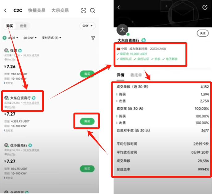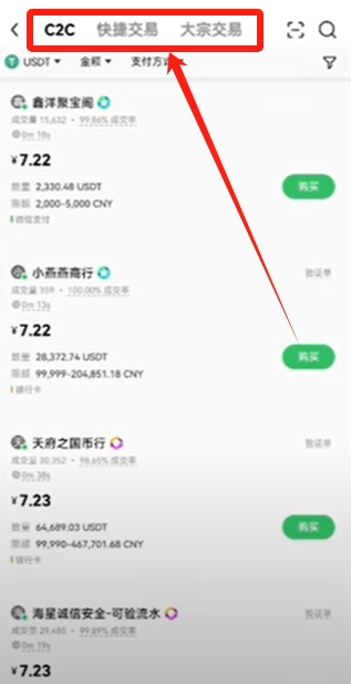 可以看到它上方一共有三个选项,分别是C2C买币、快捷交易和大宗交易。“快捷买币”顾名思义就是比较方便,是平台会自动帮我们撮合一个商家。“C2C买币”有很多的筛选需求,就是我们按照自己的需求去筛选商家的。我们今天演示的方法,不管你是大额小额买USDT都是可以使用的。
