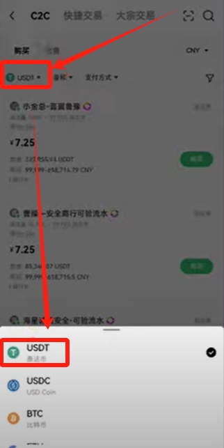 我们选择“C2C买币”,要购买的是USDT,也就是泰达币。