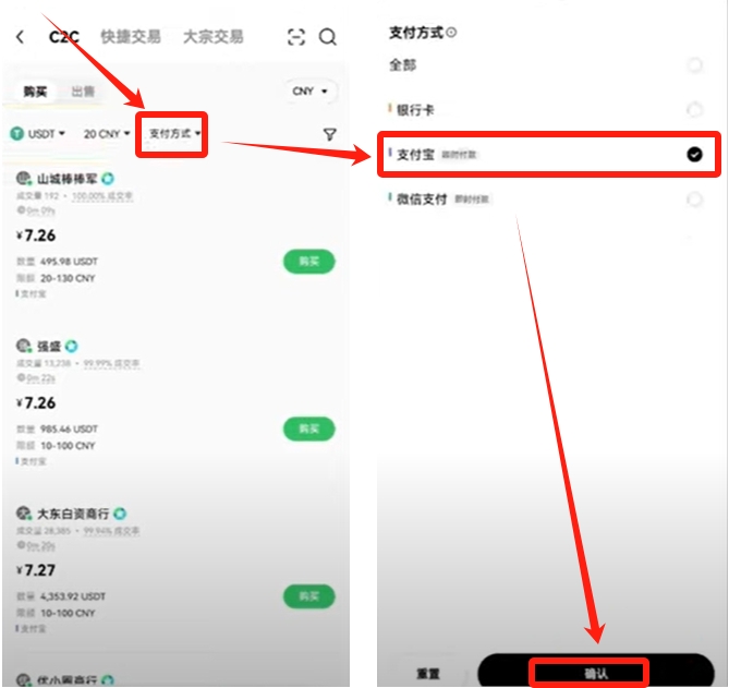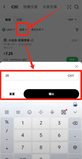 筛选一下金额,输入你要购买多少钱的USDT,今天我就拿20元来做一个演示,点击【确认】。这样他就会给你筛选出所有符合你需求的商家。