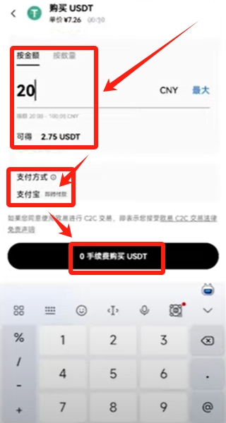再次输入一下你要购买的金额,下方也会自动为我们算出来,支付20元软妹币将会收到2.75个USDT。支付方式就是支付宝及时付款,然后点击下方的【0手续费购买USDT】。