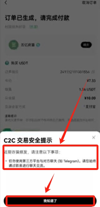 这边会弹出一个C2C交易安全提示,我们来看一下。“不要使用第三方平台与对方聊天,请您始终通过欧易进行聊天交流。如果你已经付款,不要取消订单,如果对方有此要求一定要提出申诉”。点击【我知道了】。