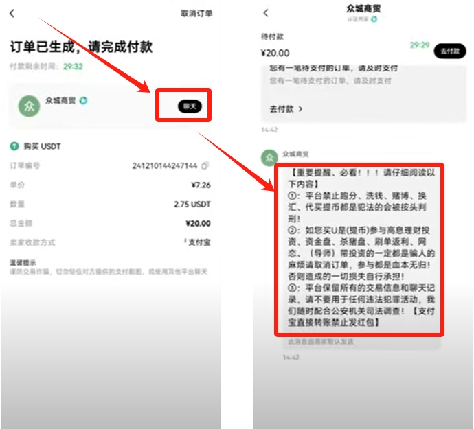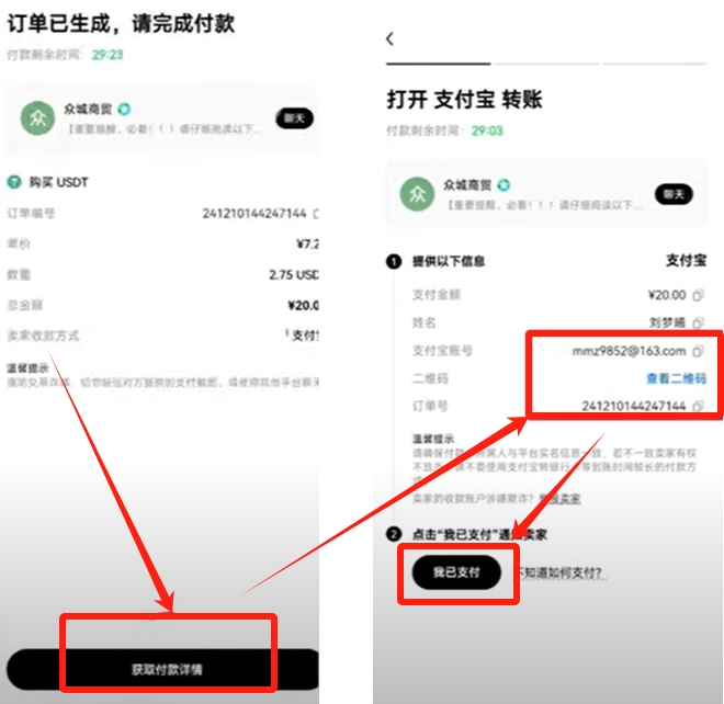 我们再次返回点击下方【获取付款详情】,就会出现对方的支付宝账号和二维码,我们直接保存他的二维码,去我们的支付宝里面进行转账。转完钱之后点击【我已支付】。