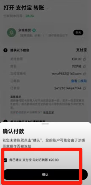确认付款,我已通过支付宝向对方转账20元,点击【确认】。