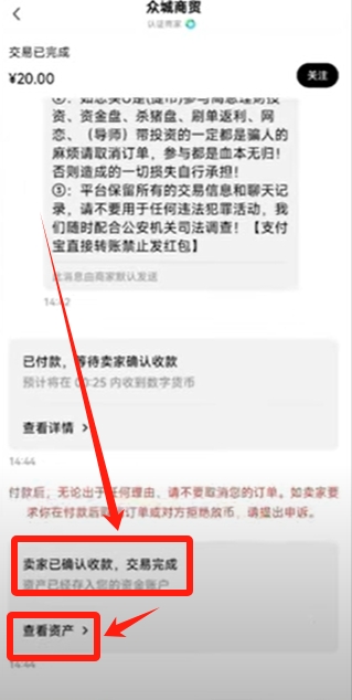 等待卖家核实收到钱之后,就会把币放给我们了。我们的交易已经完成了,卖家已经确认收款,交易已经完成,资产已经存到了我的资金账户里面了。我们可以直接点击“查看资产”。
