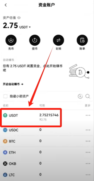 也可以点击右下角的资产,找到上方的资金账户,在这里就可以看到我们购买好的USDT了。