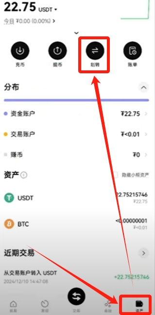 如果我们需要交易,要从资金账户划转到交易账户才可以去进行交易。我们直接点击“资产”,再点击【划转】。