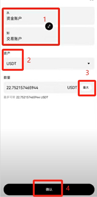 从资金账户到交易账户,币种就选择USDT,数量选择最大,点击【确认】,这样我们就划转成功了。
