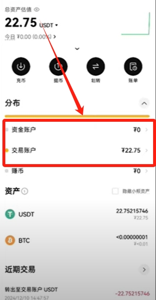 我们可以返回去查看一下,USDT就从资金账户转移到了交易账户,整个购买USDT的流程就已经结束了。接下来你就可以用USDT去买你想买的任何加密货币了。