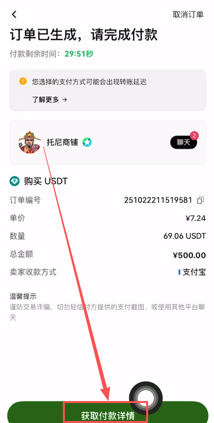 之后我们根据商家提供的支付方式给对方转钱,转完钱之后点击【我已支付】,等待卖家核实收到钱之后,就会把币打给我们了。这样我们的USDT就买好了。