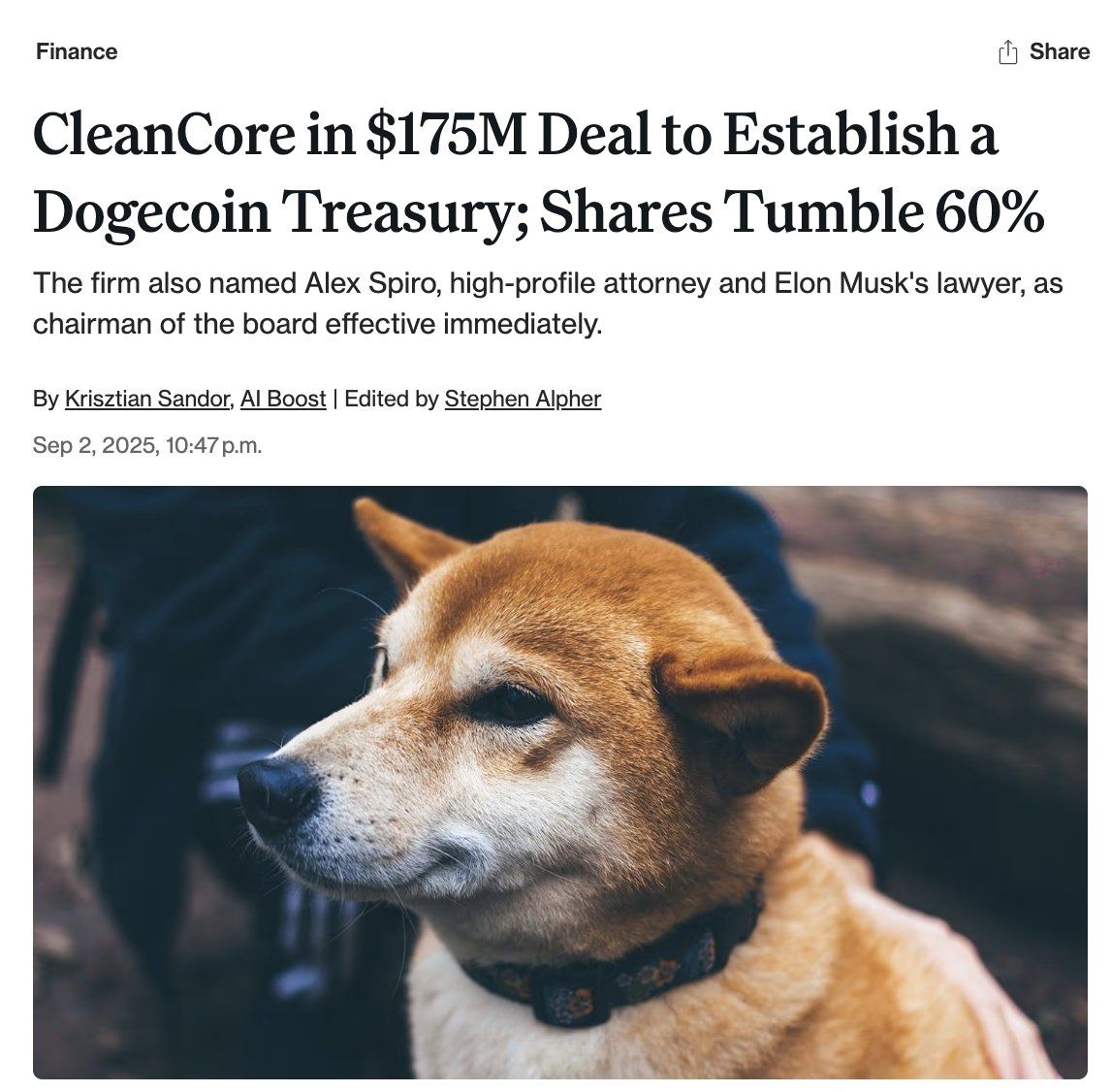 CleanCore Solution (NYSE: ZONE) 创建狗狗币财库| 资料来源:Coindesk