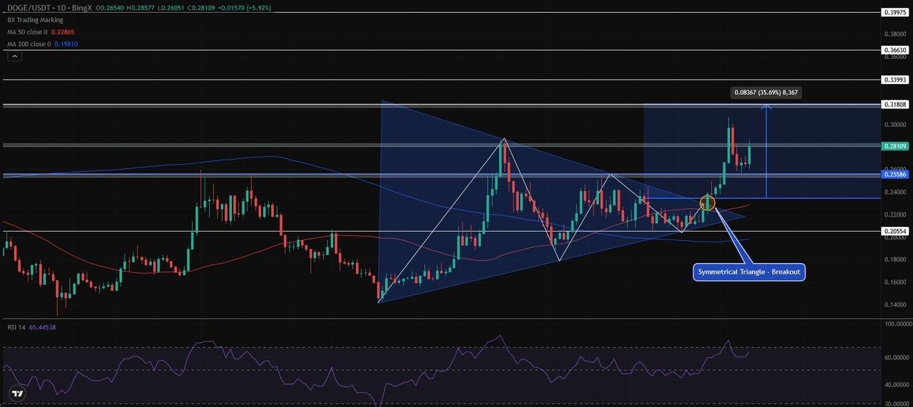 日线图:DOGE 突破,动能指向0.318–0.339 美元