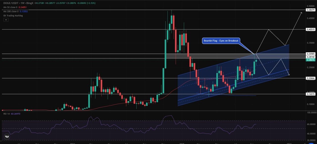 周线图:DOGE 正在测试旗形阻力位,上涨目标为0.405–0.484 美元