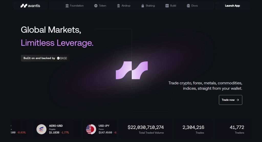 Avantis 是一个先进的跨资产杠杆链上交易所,于2024 年上线,并在Base 网络上运行。该平台允许用户交易加密货币、外汇、贵金属、商品等合成资产,并即将在未来推出股票。
