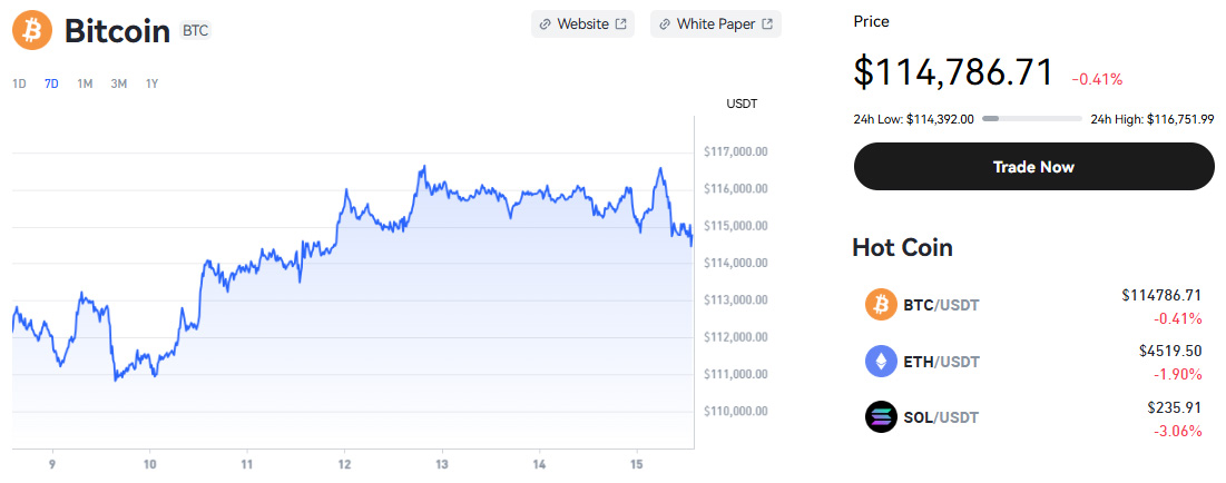 BTC 近期突破 116,000 美元,预计今年BTC 价格将达到 150,000 美元或更高,上限取决于宏观经济状况和持续的机构流动。截至本文撰写时,BTC 交易价格约为 114,800 美元。