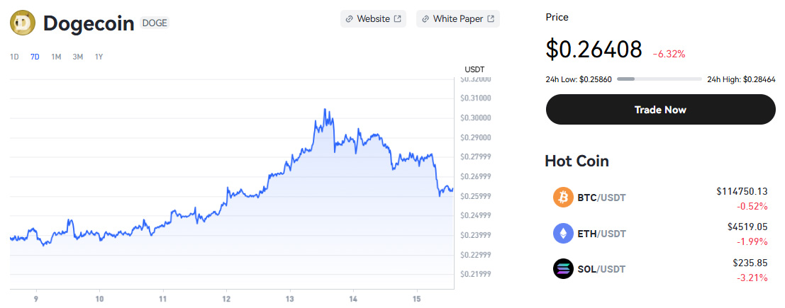 根据最新数据,狗狗币的价格徘徊在 0.20 美元到 0.25 美元之间,不过在撰写本文时,狗狗币的价格约为 0.26 美元。如果你分析狗狗币的价格图表,就会发现该币种在关键支撑位上表现坚挺,这证明了它不仅仅是一个昙花一现的梗。