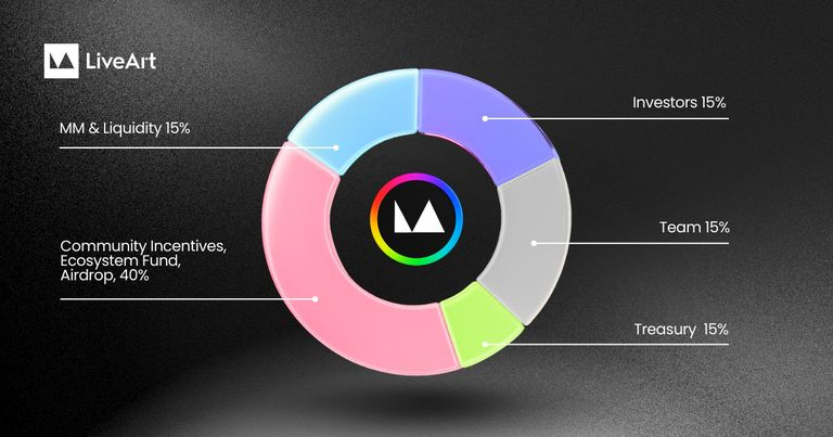 ART 是 LiveArt 生态系统的实用型代币,固定供应量为 10 亿枚。其分配将分配给投资者、流动性储备、创始团队、社区激励和项目金库,其中最大份额将用于用户奖励和生态系统发展。社区空投将 ART 引入早期支持者,但大多数分配都受归属计划约束,以防止突然出现抛售压力。