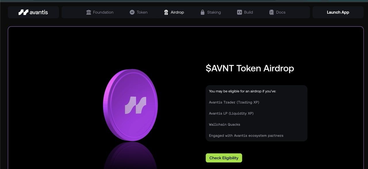 Avantis 空投是首次向在代币发行前支持协议的早期用户分发AVNT 代币。此举旨在奖励那些曾帮助测试、交易或为Avantis 提供流动性的交易者、流动性提供者(LPs)和社区成员。