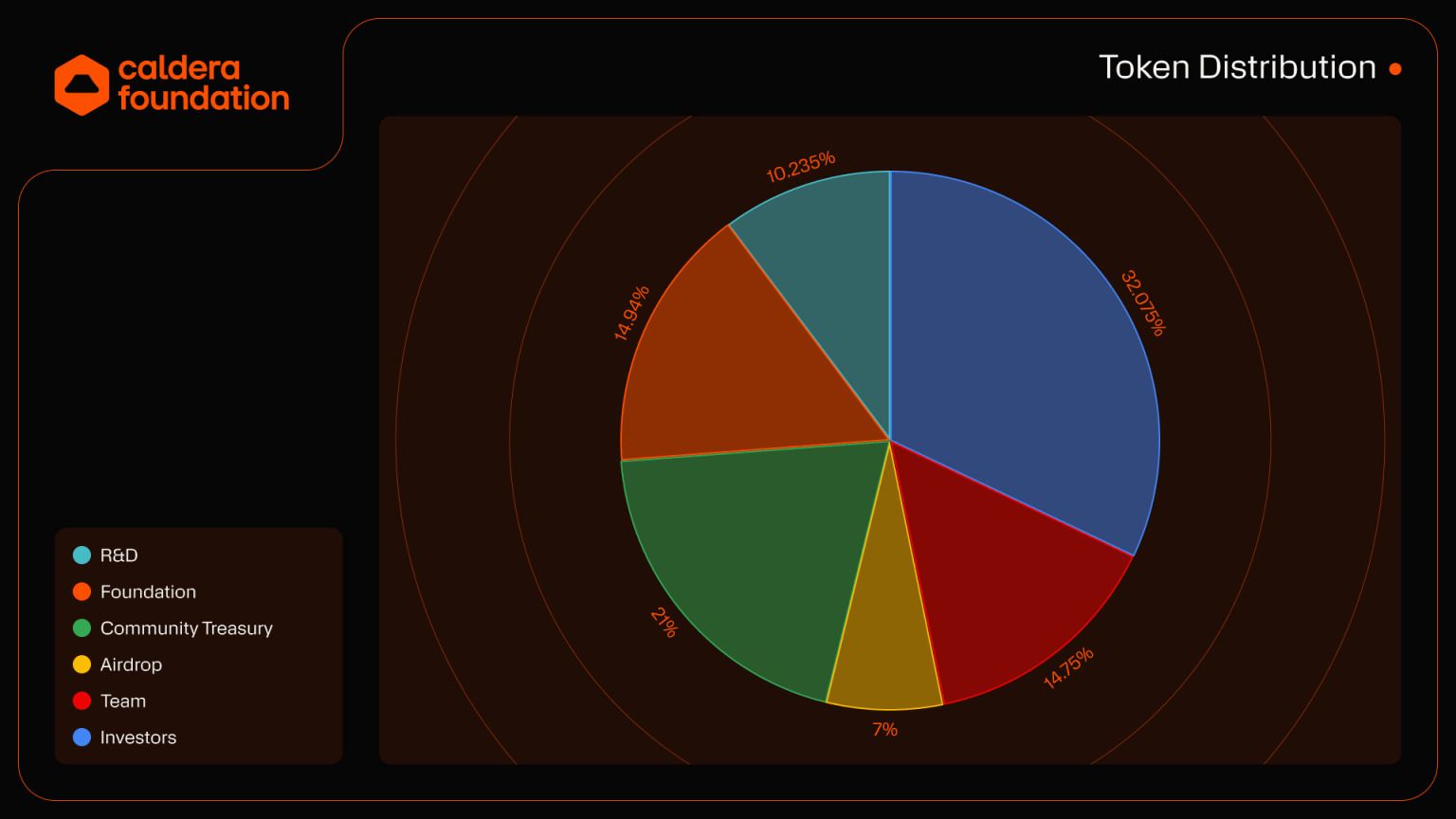 总供应量的 7.0% 将通过空投分配给顶级 Caldera 社区成员、Caldera Chain 用户和顶级 Layer 2 参与者。基金会(社区和基金会基金):35.94%