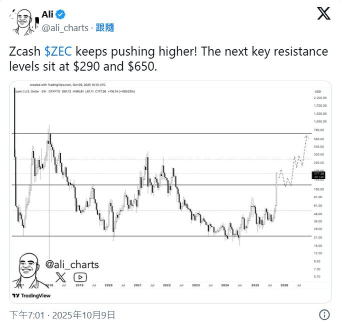 顶级加密货币分析师 Ali Martinez 预计 ZEC 涨势将在未来几周持续,并强调下一个主要阻力位在 290 美元和 650 美元。