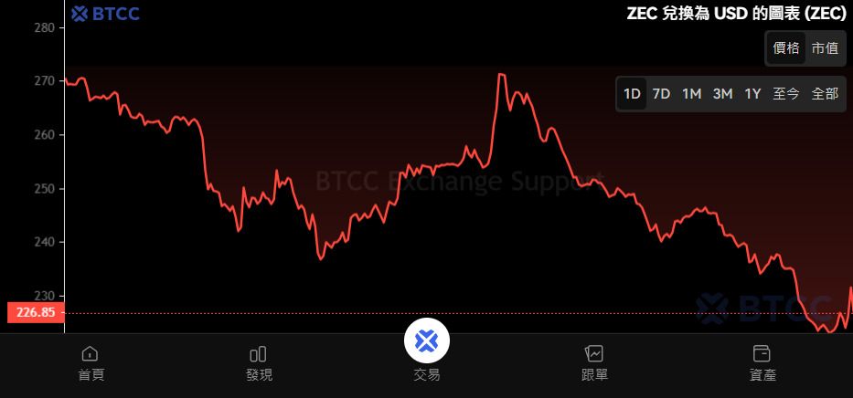 截止 10 月 10 日撰写本文时,ZEC 币在 BTCC 市场的交易价格为 238.14 美元,24 小时涨幅超 31.39,交易量达到 $1,441,554,840.68。目前,ZEC 币在 CoinMarketCap 上排名第 32 位,即时市值为 $3,870,635,651.79 美元。