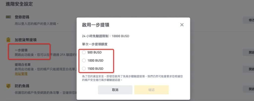 白名单提钱也需要2FA验证,币安同时提供「小额提领」到白名单时,可以不做2FA验证,额度可以由用户自己设置为500BUSD、1000BUSD或1500BUSD。
