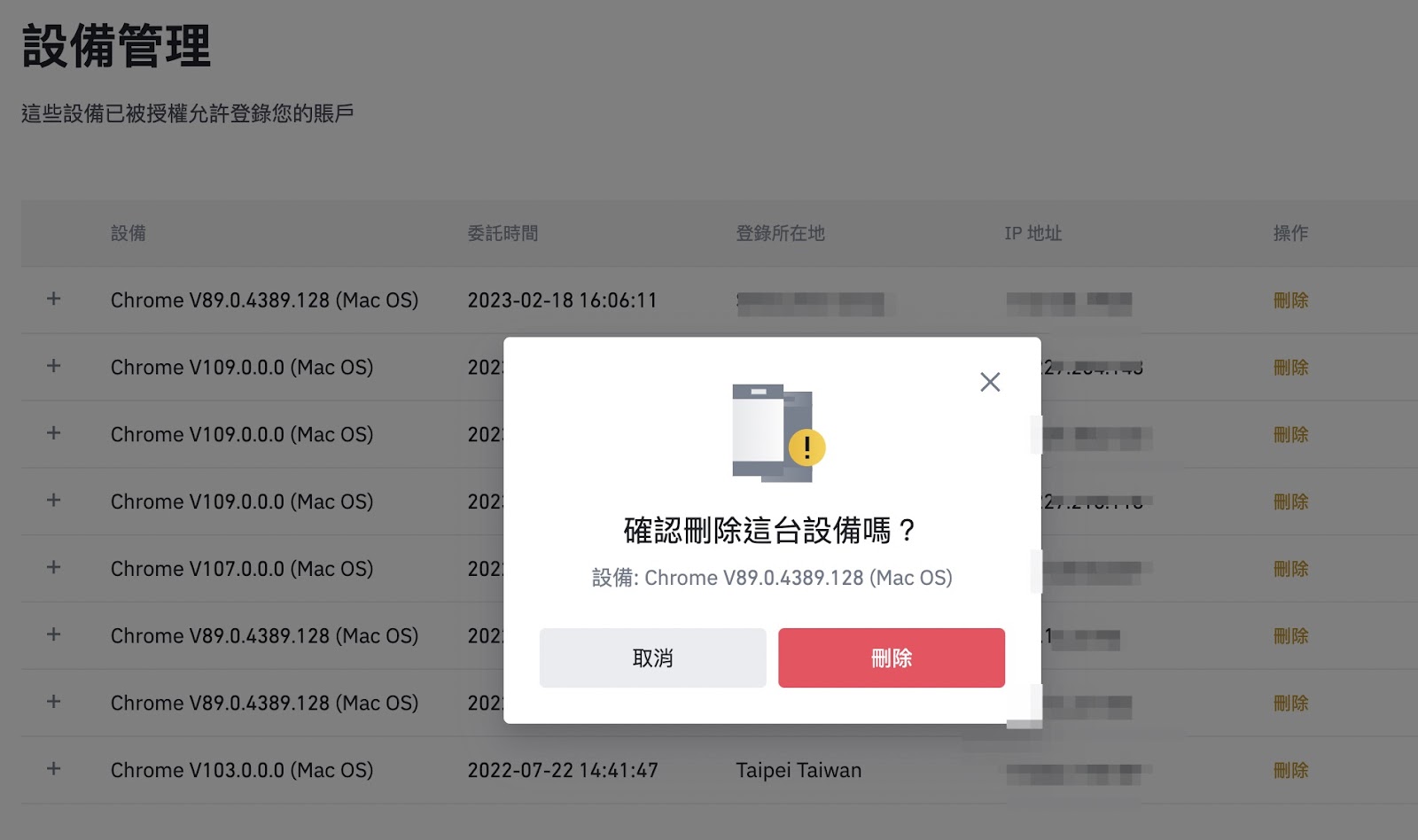 在安全中心用户能够检查访问的所有设备,用户查看授权登录账号的设备、IP、委托时间、所在地,如果用户发现是可疑设备,允许用户做「删除」操作。