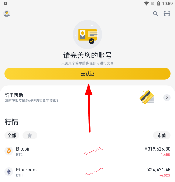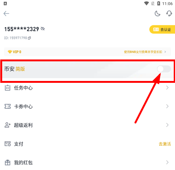 第二步注册或登录币安app后, 您可以在app个人中心页切换币安简版或专业版,选择币安简版,进入币安简版首页。