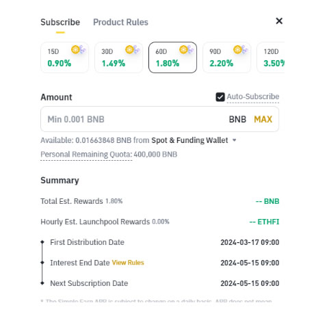 4. 如要开始利用持有资产获利,您须选择并申购一种资产。添加打算使用的资金金额,检查汇总的信息,准备就绪后点击“确认”。