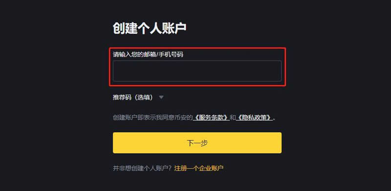 2、币安已全面开放大陆用户进行手机号注册,输入邮箱/手机号、点击下一步即可