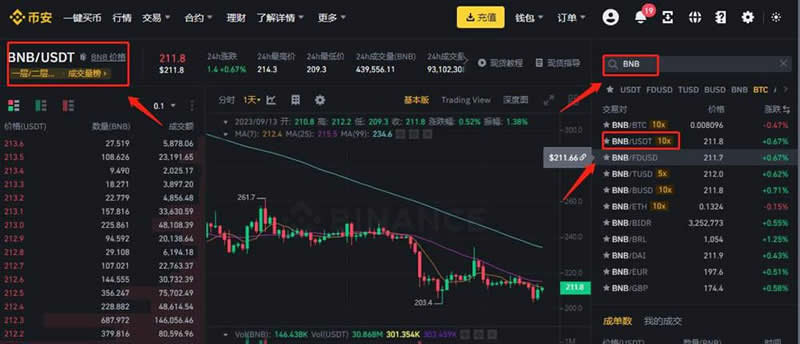 7、搜索币种简称【BNB】,选择【BNB/USDT】交易对