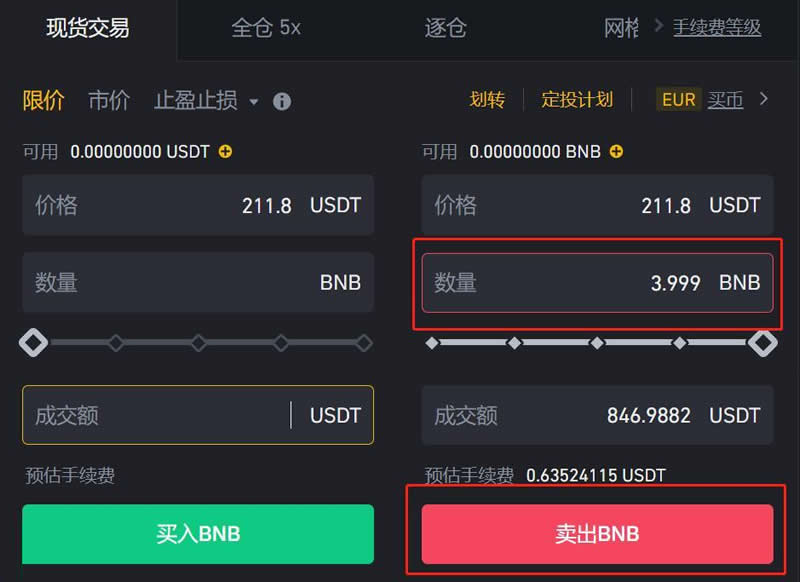 8、填写卖出数量,点击【卖出BNB】即可完成BNB币交易