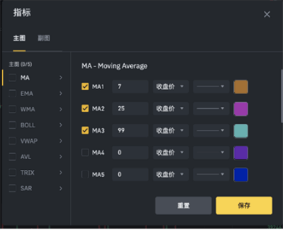 2.挑选您想在图表中展示的指数,并根据个人喜好自定义颜色设置,使图表分析更为直观明了。调整完毕后,点击“保存”以应用更改。若您希望恢复到默认颜色配置,只需点击“重置”按钮即可轻松实现。