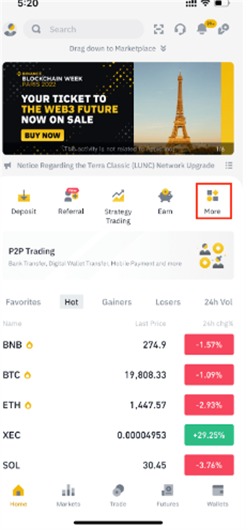 2.打开币安应用后,你会看到主页界面。点击主页上的“更多”选项,这里会列出应用的其他功能。