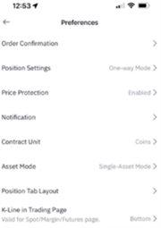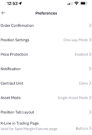 3.一旦您点击“更多”按钮,一个弹出菜单将出现在屏幕上。在这个菜单中,您会看到一个名为“偏好设定”的选项。选择这个选项将带您进入一个全新的页面,其中包含一系列与合约交易相关的设置。在这里,您将找到一个“资产模式”选项,它允许您在“单资产模式”和“多资产模式”之间进行选择。根据自己的交易需求和偏好,选择合适的资产模式,从而更好地管理您的交易活动和策略。