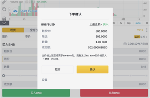 1.在必安交易所现货交易页面,选择买入或卖出方向,设定止盈止损触发价为500 BUSD以控制风险。限价设为502 BUSD,表示愿以该价或更低买入BNB。确定买入数量后,点击买入BNB按钮提交订单。