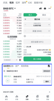 2.若要买BNB,先选BTC/BNB交易对,再选择“限价单”交易类型。在“价格”框内输入你期望的购买价格。