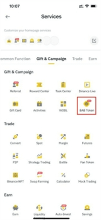 1.登录币安App,点击首页的【更多】 。向下滚动至【礼物与活动】 - 【BAB 代币】。