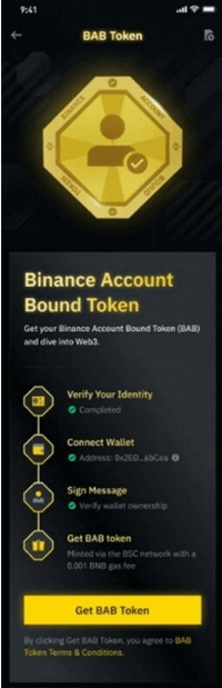 Binance Account Bound (BAB) 代币是第一个建立在 BNB 链上的 Soulbound 代币 (SBT)。BAB 代币不可转让且没有货币价值。它将作为已完成身份验证的币安用户的数字验证工具。
