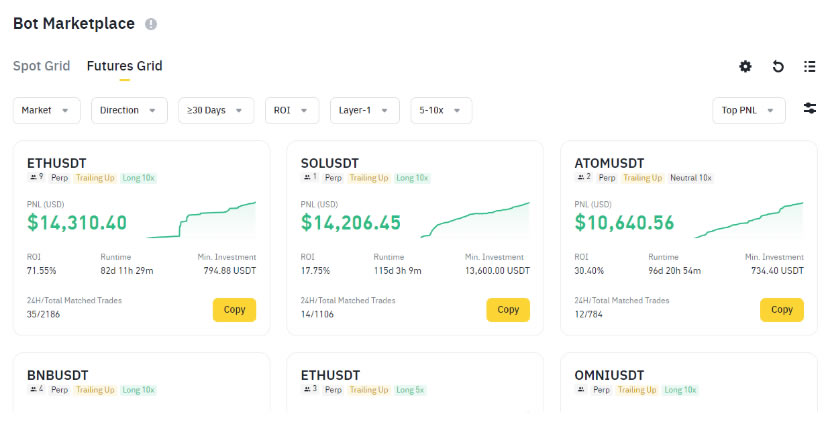 在交易机器人落地页上,您可以找到机器人市场。它让用户能够复制现有策略的机器人参数,并涵盖币安现货和合约上最热门的网格交易策略。在“现货网格”或“合约网格”选项卡中,使用“市场”、“收益率”和“运行时间”等筛选条件,即可对选项进行筛选。