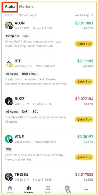 币安 Alpha 是币安钱袋内的一个平台,专注于发掘具有增长潜力的全新和早期加密货币项目。币安 Alpha 上展示的部分代币未来有望在币安交易平台上架,但并不保证。