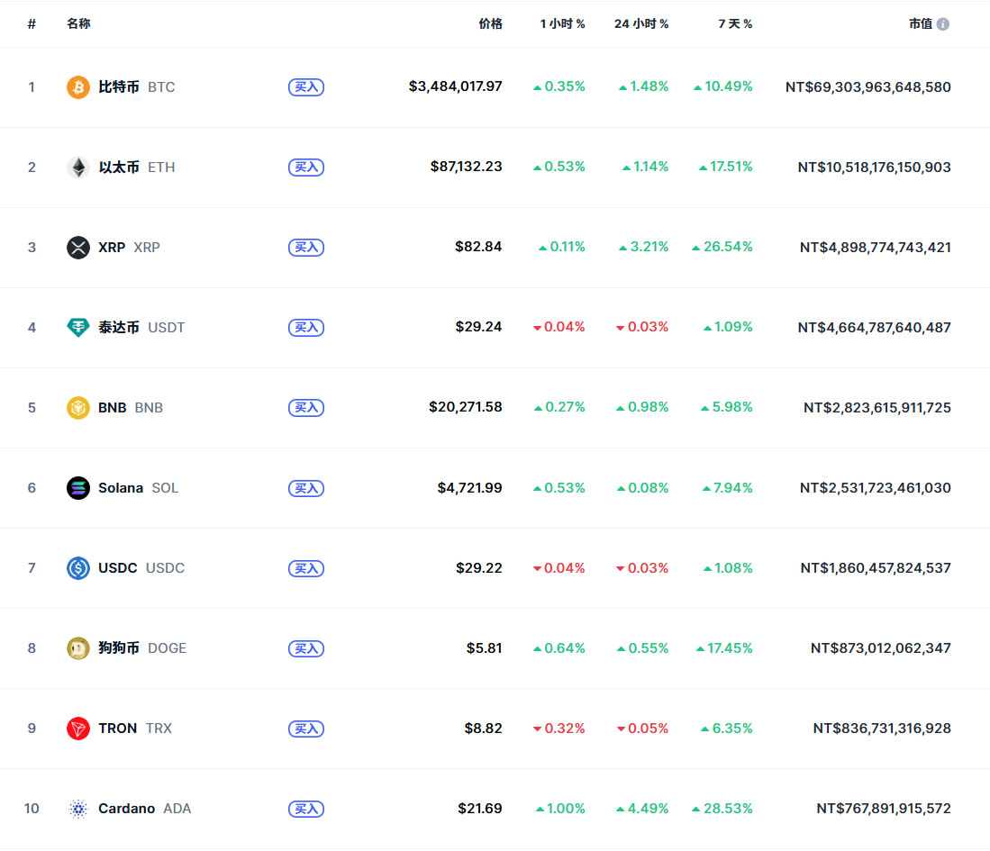 根据Coinmarketcap,目前市值前十大的虚拟货币如图(2025/7)。