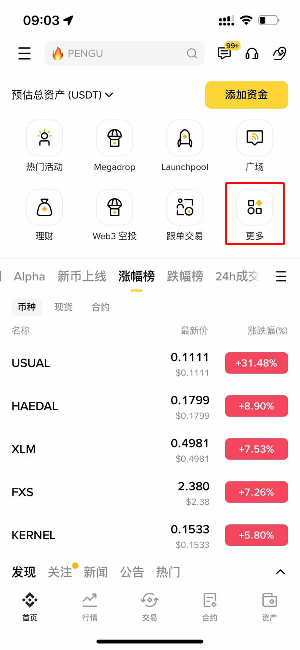 首先,打开币安APP 首页,并点选「更多」进入功能选单的页面