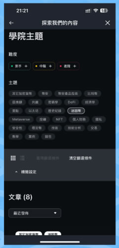 但你仍然可以先学习学院内的其他课程,包含了不同主题&难度,你都可以尽情挑选有兴趣的课程内容,让你从「虚拟货币新手」晋升为「虚拟货币老手」。