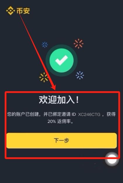 5、它会显示我们的账户已经创建,并且绑定了邀请码XC246CTG,获得了20%的返佣率。如果您是通过我的二维码进来的,这里会自动为您绑定好,如果没有您可以手动填写XC246CTG来注册,是同样会获得20%的返佣率的。然后点击【下一步】。