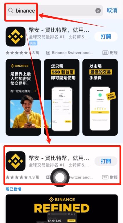 8、搜索“binance”,选择币安进行下载就好了。大家要下载第二个,因为第一个是广告。
